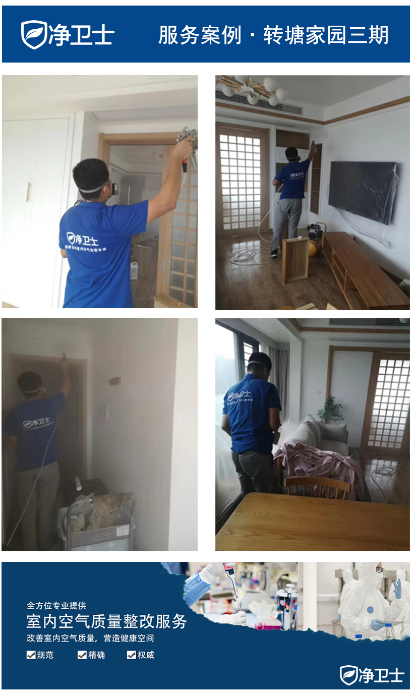 施工详情:室内污染分析:主要污染来自松木家具,墙纸 ,布艺纺织物地毯 窗帘等,新房除味除醛治理后,复检合格,异味明显下降。